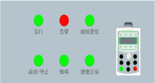 控制面板有啟動(dòng)/停止旋鈕,速度調(diào)節(jié)旋鈕,變頻器顯示和設(shè)置小面板,還包括運(yùn)行、蜂鳴、告警指示燈,*作簡單。